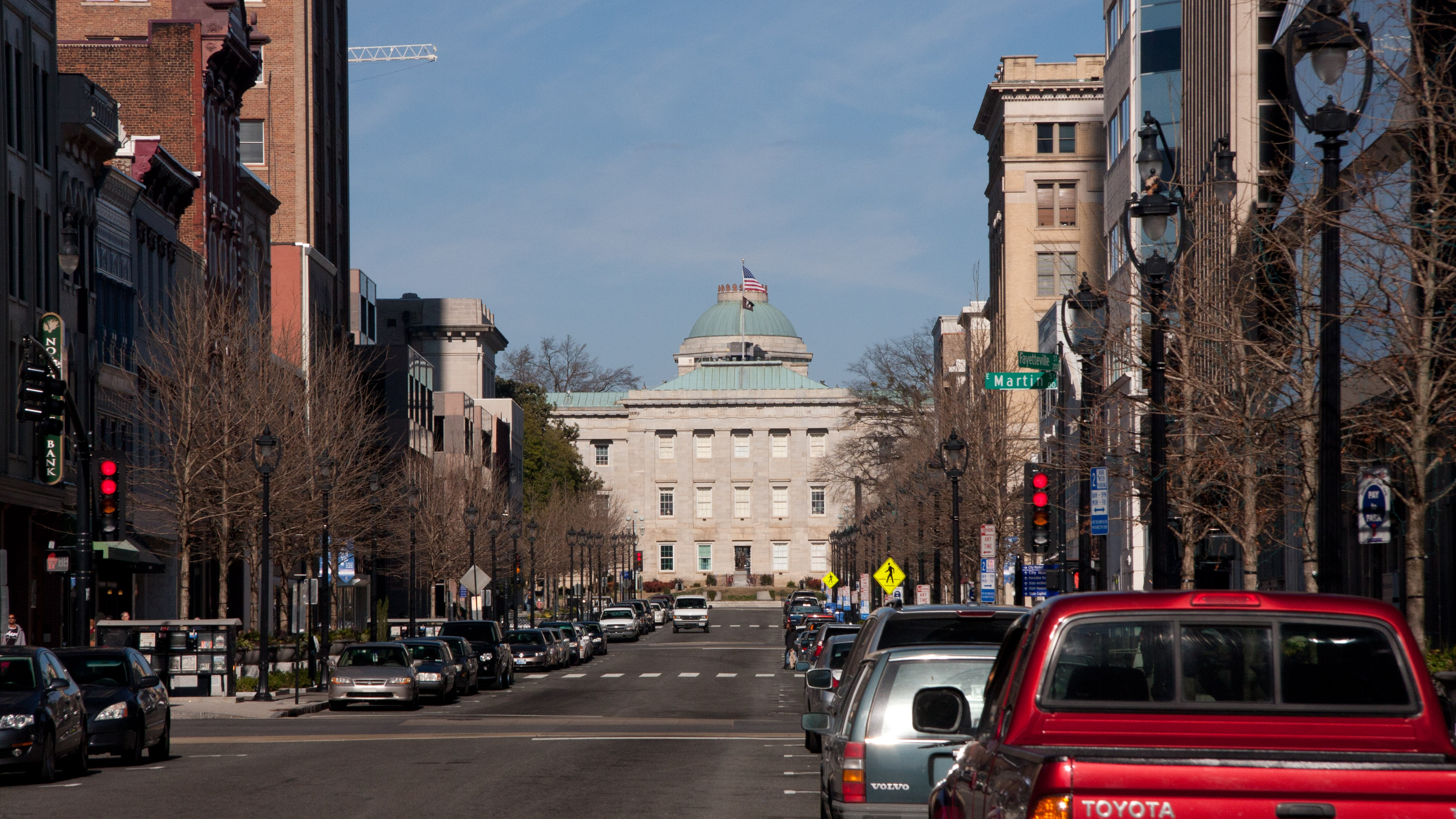 A view looking north on Fayetteville Street in Downtown Raleigh towards the North Carolina Capitol building.